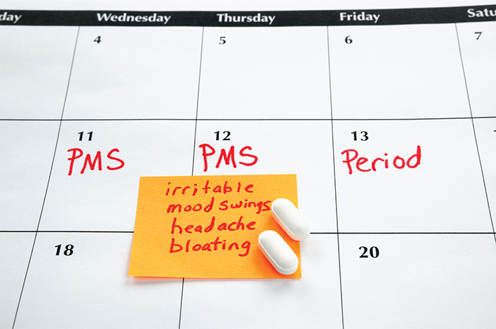 Premenstrual syndrome (PMS) is the name given to the physical, psychological and behavioural symptoms that can occur in the two weeks before a woman's monthly period. Symptoms include bloating, breast pain, mood swings, irritability and loss of interest in sex. The symptoms improve when the period starts and disappear a few days afterwards.