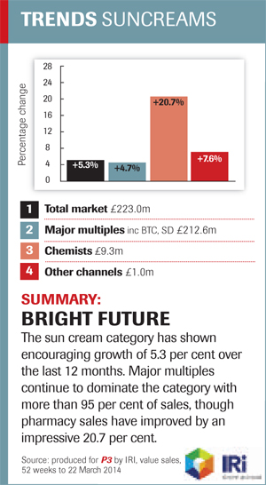 Alan Bradley, Cornwell's Chemist, Stoke-on-Trent 'While the products in this category don't tend to vary much from year to year, the information and knowledge regarding safe travel during the summer period does. It's important that we always offer health advice for travelling abroad, on being in the sun and protecting skin and eyes and insect repellants, etc. I believe that the public look to pharmacy more than any other resource for advice and guidance on skin protection in the sun and do listen to the advice we give. As a result, I feel that we should do the most we can to ensure we offer affordable sun creams which appeal to the public, such as the spray on products and long-lasting sun blocks tend to appeal to parents, and I will not sell creams with an SPF less than 20.'