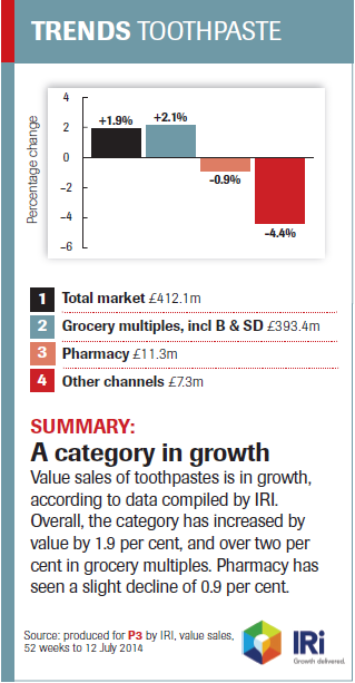 Oral care is enjoying healthy growth, up four per cent in the last two years, with sales mostly driven by mouthwash and dental accessories/denture products, according to Mintel. The analyst predicts that by 2018 the market will grow by 21 per cent to £1.2 billion. Own label sales have contributed to growth, accounting for 51 per cent of launches in 2013 and the own label dental accessories sector also saw sales rise by 19 per cent. Toothpaste sales, worth over £400 million across the total market, have grown by almost two per cent in the past year, according to market analysts IRI.