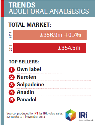 'Stock brand leaders which cover a range of pain relief options and also an own label representation of each of the drug types where relevant. GSL lines should be on open display to facilitate self selection. Merchandise the pain category by brand and format with pack sizes merchandising left to right and from large to small,' advises Ms Charlesworth at Numark.