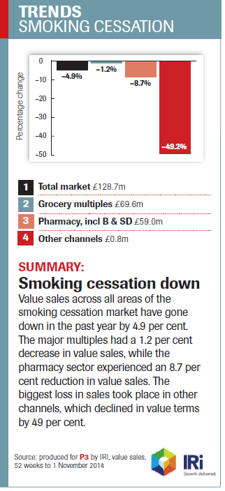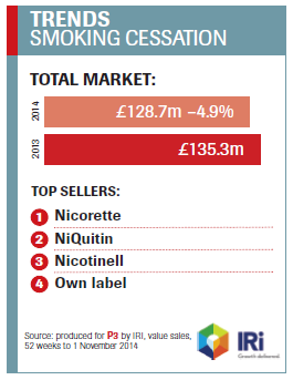 Sales of smoking cessation aids, such as nicotine replacement therapy (NRT), have slowed, according to recent data from analysts IRI. In 2014, the smoking cessation market declined by nearly 5 per cent to a value just under £129 million (see graph on right). The UK market for e-cigarettes, on the other hand, is booming, with an estimated value expected to be around £340 million in the UK during 2015, according to Public Health England.