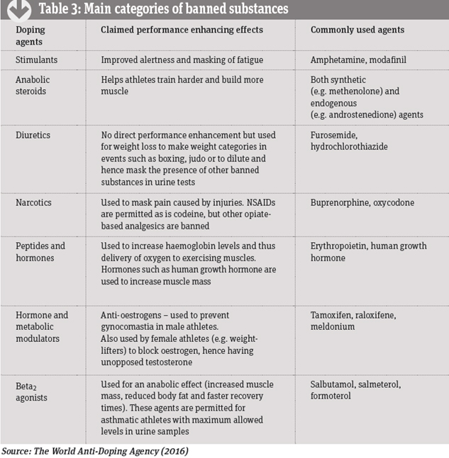 Professional athletes are under enormous pressure to excel at their particular sport and success brings not only a gold medal, but also financially lucrative sponsorship deals. This drive to win at all costs has resulted in some athletes using banned substances to enhance performance. There are several different categories of doping agents (see Table 3).