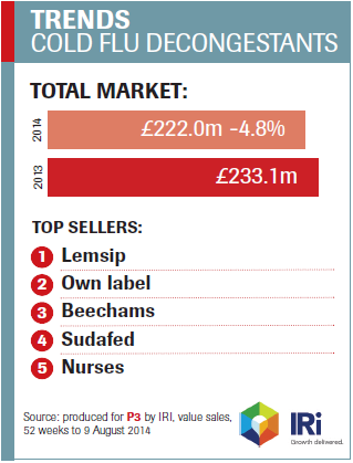 Alan Bradley, Cornwell's Chemist, Newcastle-under-Lyme 'The cold and flu category is one of the biggest selling points for pharmacy and there are so many products available that there is always something suitable for a customer, regardless of what medication they are taking. If a customer comes in with cold and flu symptoms we would generally recommend a menthol-based product to improve their breathing. We always advise them to use products that won't interact with any other medication. One of our favourites, due to its extensive use and the fact it doesn't interact with any other medicine, is Lemsip Max, which can be swallowed whole or dissolved if a patient has a sore throat. Another favourite is the Lemsip Cough Mixture for Mucus Coughs.'