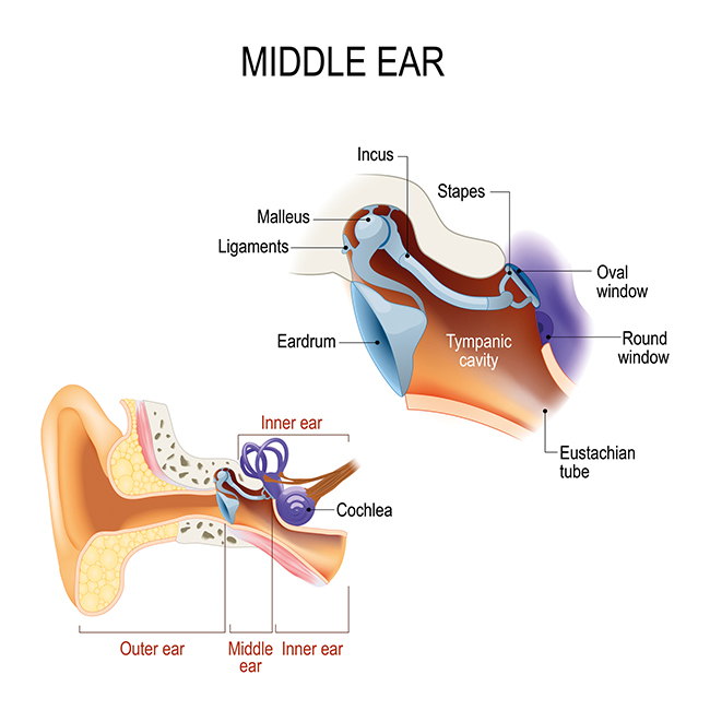 The ear has two functions: hearing and balance. The outer ear is shaped to catch sound waves and funnel them through the ear canal to the ear drum. The middle ear amplifies the vibrations on the ear drum and transmits them to the oval window, a thin membrane that seals the inner ear. The inner ear consists of two parts: the cochlea, which performs the hearing function, and the vestibular system, which helps maintain balance.1