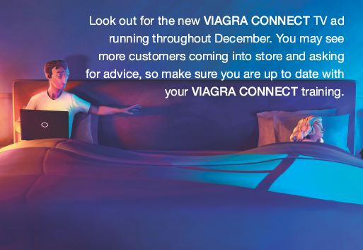 VIAGRA CONNECT 50mg Film Coated tablets Active ingredient: Sildenafil Supply classification: P Indications: For erectile dysfunction in adult men. Further information about this product, including adverse reactions, precautions, contraindications and method of use can be found at https://www.medicines.org.uk/emc/product/8725 or from Upjohn - a Pfizer division, Walton Oaks, Surrey, KT20 7NS.