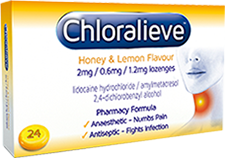 Name of product and active ingredients: Chloralieve Honey & Lemon Flavour Lozenges 2mg Lidocaine / 0.6mg Amylmetacresol/ 1.2mg 2,4-Dichlorobenzyl Alcohol. Classification: 'P'. Indications: Relief of symptoms of sore throat in adults and adolescents over 12 years of age. MAH: Prestige Brands (UK) Ltd, 5-7 London Road, St. Albans, AL1 1LA, United Kingdom. Telephone: +44 (0) 1727 515 310. Information about this product, including adverse reactions, precautions, contra-indications, and method of use can be found at: http://www.mhra.gov.uk/Safetyinformation/Medicinesinformation/SPCandPILs/index.htm or from Prestige Brands (UK) Ltd.