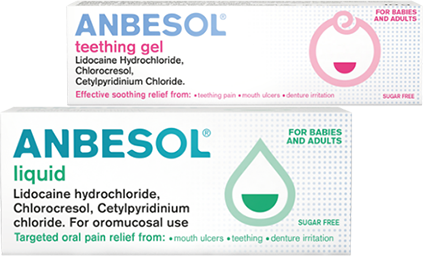 Anbesol Liquid (lidocaine hydrochloride 0.9% w/w, chlorocresol 0.1% w/w, cetylpyridinium chloride 0.02% w/w). Indication: Adults, the elderly and children: For the temporary relief of pain caused by recurrent mouth ulcers, denture irritation. In children from 5 months: For relief of pain and discomfort associated with teething where non-pharmacological treatments have failed to provide sufficient relief. Legal Classification: P. Marketing Authorisation Holder: Alliance Pharmaceuticals Limited, Avonbridge House, Bath Road, Chippenham, Wiltshire, SN15 2BB, UK. Information about this product, including adverse reactions, precautions, contraindications and method of use can be found at https://www.medicines.org.uk/emc/product/1305/smpc