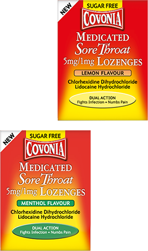 Product name: Covonia Medicated Sore Throat 5mg/1mg Lozenges Lemon Flavour. Ingredients: Chlorhexidine dihydrochloride, lidocaine hydrochloride. Indications: Disinfectant and local painkiller of sore throat and disorders of the pharynx and mouth accompanied by irritation. Legal classification: P. Information about this product, including adverse reactions, precautions, contraindications and method of use can be found at: https://www.medicines.org.uk/emc/product/9558/smpc