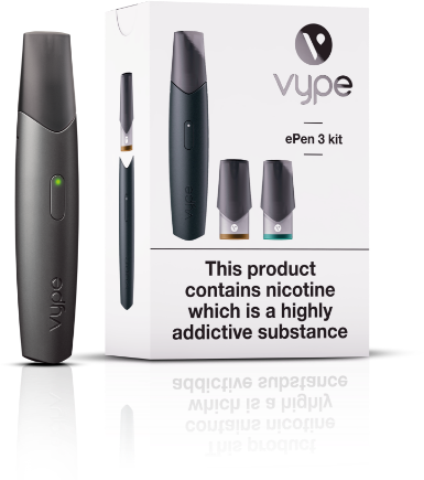 * Winner e-cigarette category. Survey 10,399 people by Kantar TNS. + In terms of battery power and nicotine delivery vs all other Vype closed-system devices. ? Comparison of smoke from a 1R6F reference cigarette and vapour from Vype ePen 3, in terms of the 9 harmful components the World Health Organisation recommends to reduce in cigarette smoke. This quality does not necessarily mean this product is less harmful than tobacco products. § By 'no tar', Vype means no tobacco-derived tar. This quality does not necessarily mean this product is less harmful than other tobacco products.