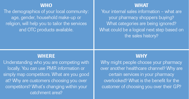 The 2011 national census is a great starting point for your research, along with reviewing your local borough's Pharmaceutical Needs Assessment, insights from GPhC inspections and, of course, pharmacy-owned data from your PMR and EPOS systems. It is a good idea to anchor your thinking in the four Ws of your customers, to understand who they are, what they buy, why they choose pharmacy over another healthcare provider and where else they could shop instead.