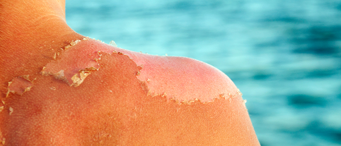 Sunburn is caused by too much sun, leading to hot and sore skin. Skin may feel hot to the touch, be sore or painful and may flake or peel a few days after the sunburn. Severe sunburn may also cause the skin to blister.1