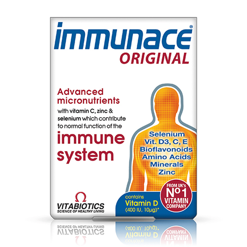 Uses: Immunace Original from Vitabiotics contains advanced micronutrients with vitamin C, zinc and selenium, which contribute to normal function of the immune system.*
