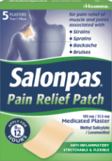 Salonpas Pain Relief Patch contains Methyl Salicylate; Levomenthol. Indications: For the symptomatic relief of pain of muscles and joints associated with strains and sprains. Legal category: GSL. Information about this product, including adverse reactions, precautions, contraindications and method of use can be found at https://mhraproductsprod.blob.core.windows.net/docs-20200204/3fb5807bbe852cb8f876082cf692e17676d812bb Marketing authorisation number: PL 23168/0001. Further information is available from Licence Holder: Hisamitsu UK Limited, 5 Chancery Lane, London WC2A 1LG, UK. Last revised: February 2020.